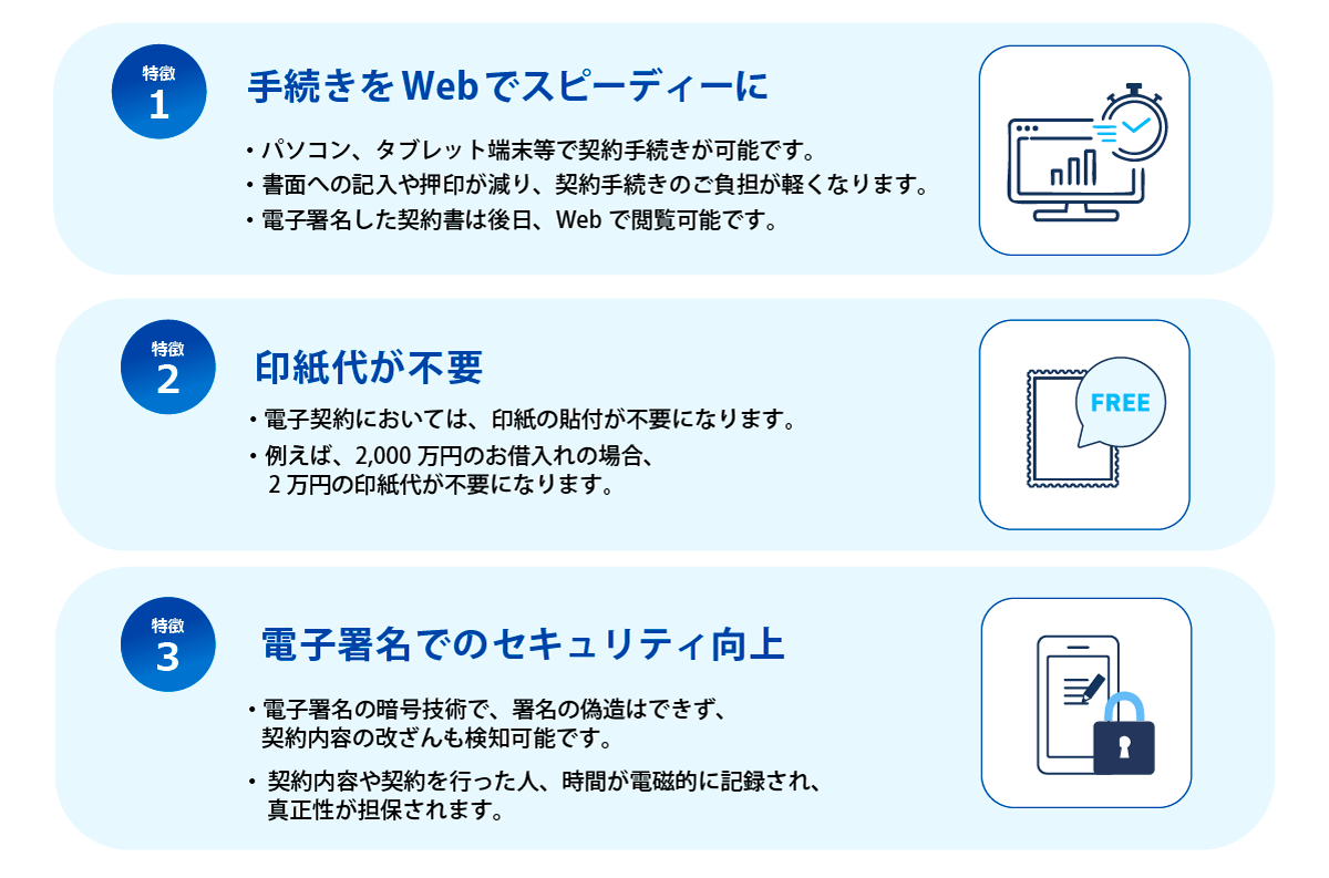 ※連帯債務者付契約、連帯保証人付契約、担保付契約、信用保証協会付融資は対象外になります。また、押印が必要な書類など、状況により書面契約をお願いする場合があります。ご了承ください。