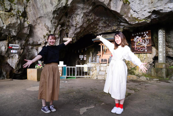 ちなみに洞内での撮影もOK。今回の体験者の2人も「天降石と絞り幕」の前ではいポーズ!