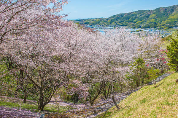 山肌を覆うように桜が咲き誇っています。公園の高台から眺めると水平線を望むことができます。