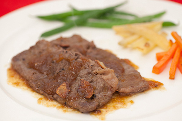 ステーキは室温に戻して焼くのがコツ。肉汁たっぷりのジューシーな味わい。